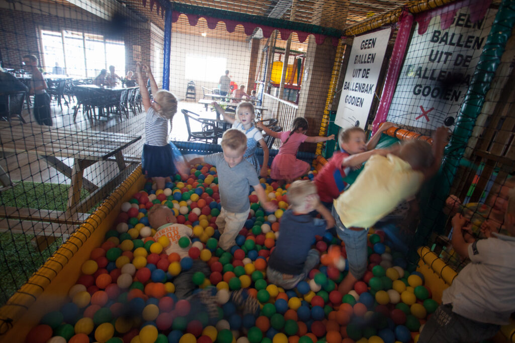 Volwassenen genieten heerlijk op het binnenterras. Er is overzicht vanaf het terras op de speeltuin voor de allerkleinsten. Het hele plafond is geluidsabsorberend uitgevoerd, dus minder last van herrie 🙂